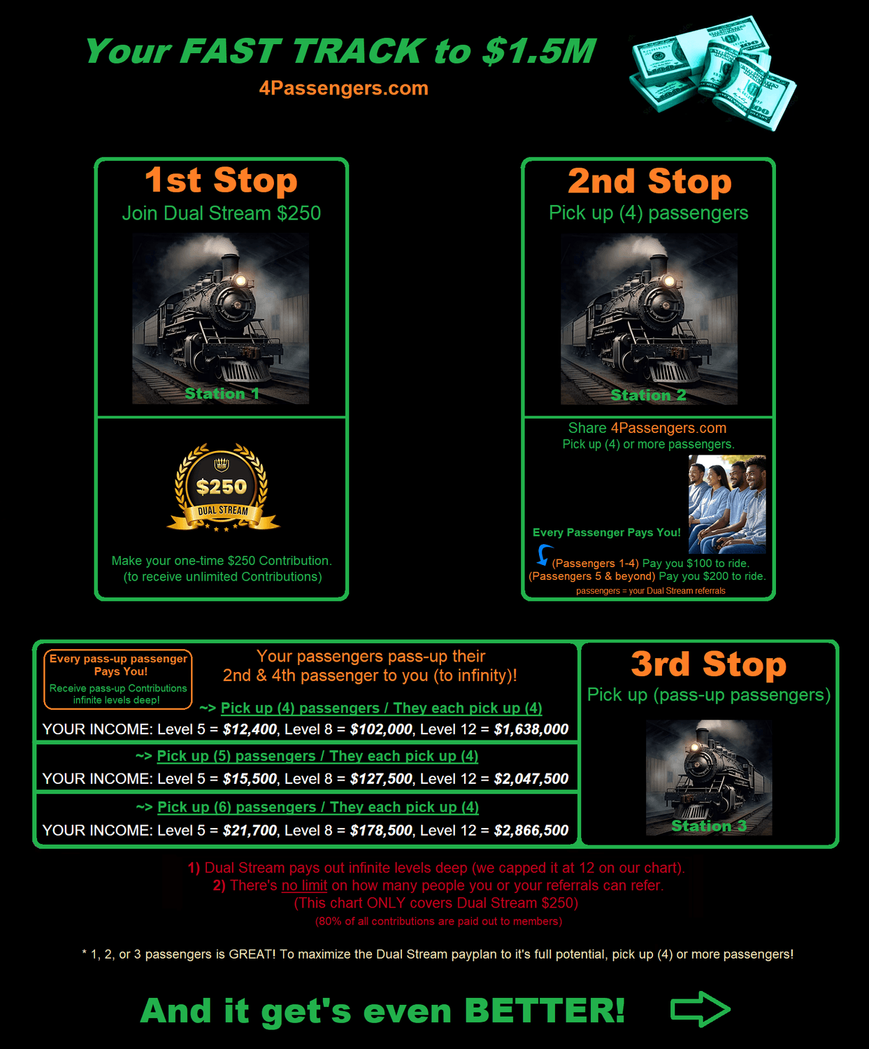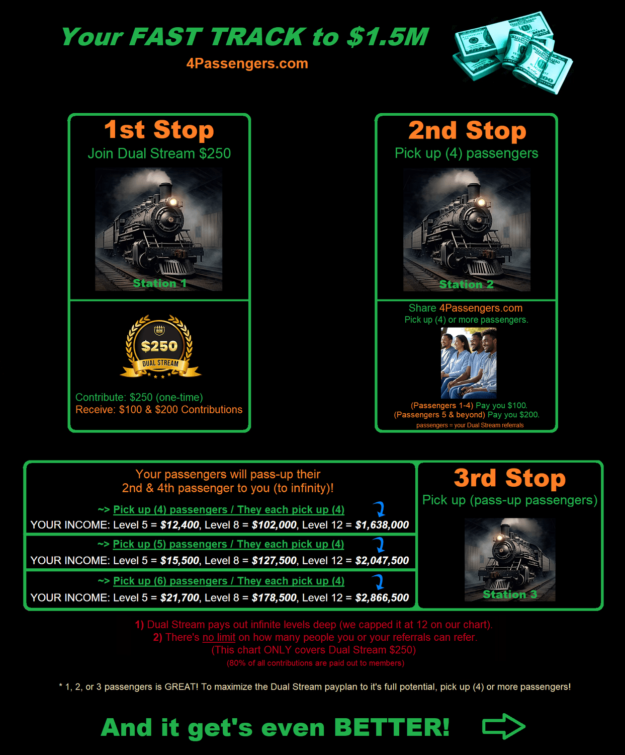 3 (Pick up (4) passengers) Share 4Passengers.com (with your referral link) with 4 or more. Receive $100 & $200 Contributions (infinite levels deep)! Upgrade from your profits & receive Larger Contributions!